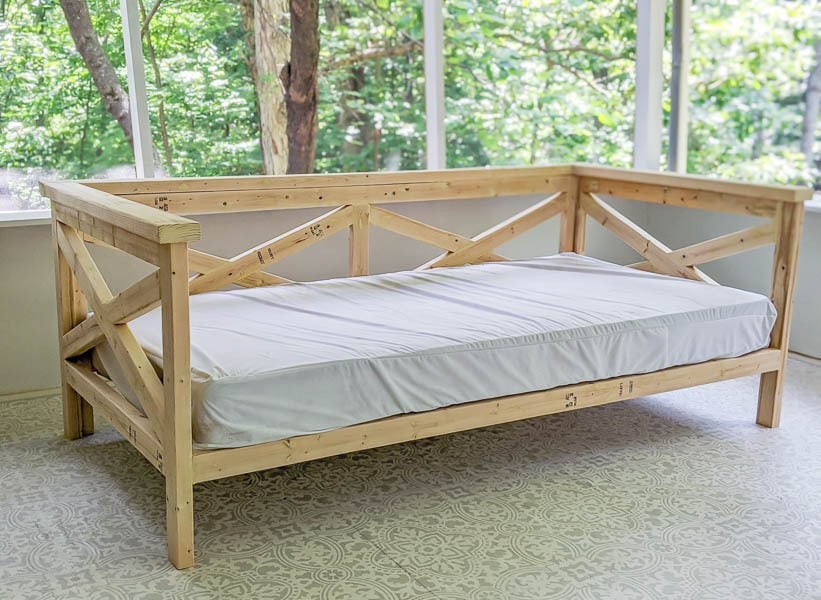 This beautiful DIY daybed is budget-friendly and simple enough that even a woodworking beginner can build it. This daybed is perfect if you need another bed or extra seating for any space, indoors or outdoors.